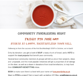 More SOUP in Buckfastleigh in June – Pitch for your Community Project / Idea Another helping of SOUP is on the way…. SOUP is a non-bureaucratic way to find out about, support, and fund local community projects. Starting in Detroit in 2010, it is now run all over the UK and is particularly suitable for […]