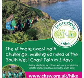 https://www.chsw.org.uk/event/incredible-hike-20 Children’s Hospice South West are organising an ‘Incredible Hike’ in May which is a fully guided 3-day challenge event where hikers take on 60 miles of the South West Coast Path. Every year, they tackle another 60 miles, walking to complete the South West Coast Path while raising money for babies, children and young […]
