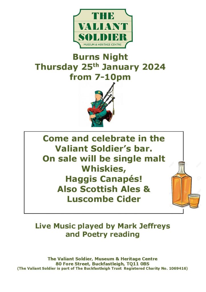 Come and celebrate in the Valiant Soldier’s bar. On sale will be single malt whiskies, haggis canapes, Scottish ales and Luscombe cider. Live music by Mark Jefferys and poetry reading.