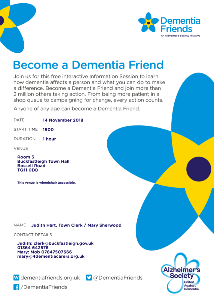 Become a Dementia Friend News 12/10/2018 Come to an hour-long presentation at the start of the Town Council meeting on November 14th to find out how to be a dementia friend