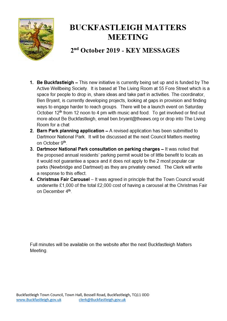 Buckfastleigh Matters Meeting 2nd October 2019 – Key Messages