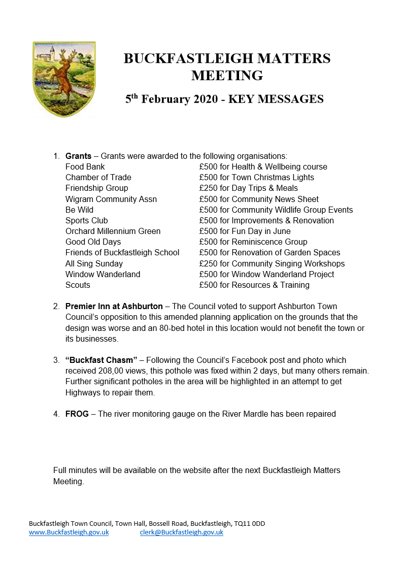Buckfastleigh Town Council Meeting 22 January 2020 – Key Messages