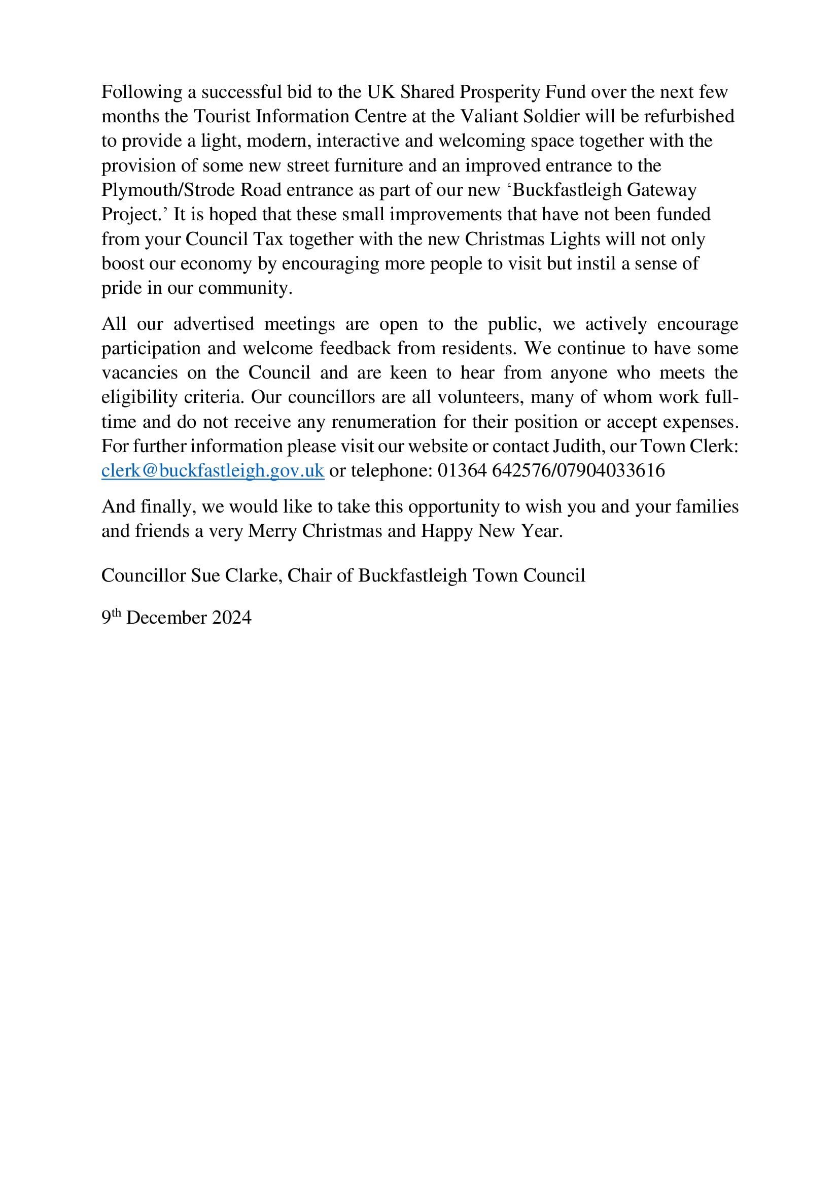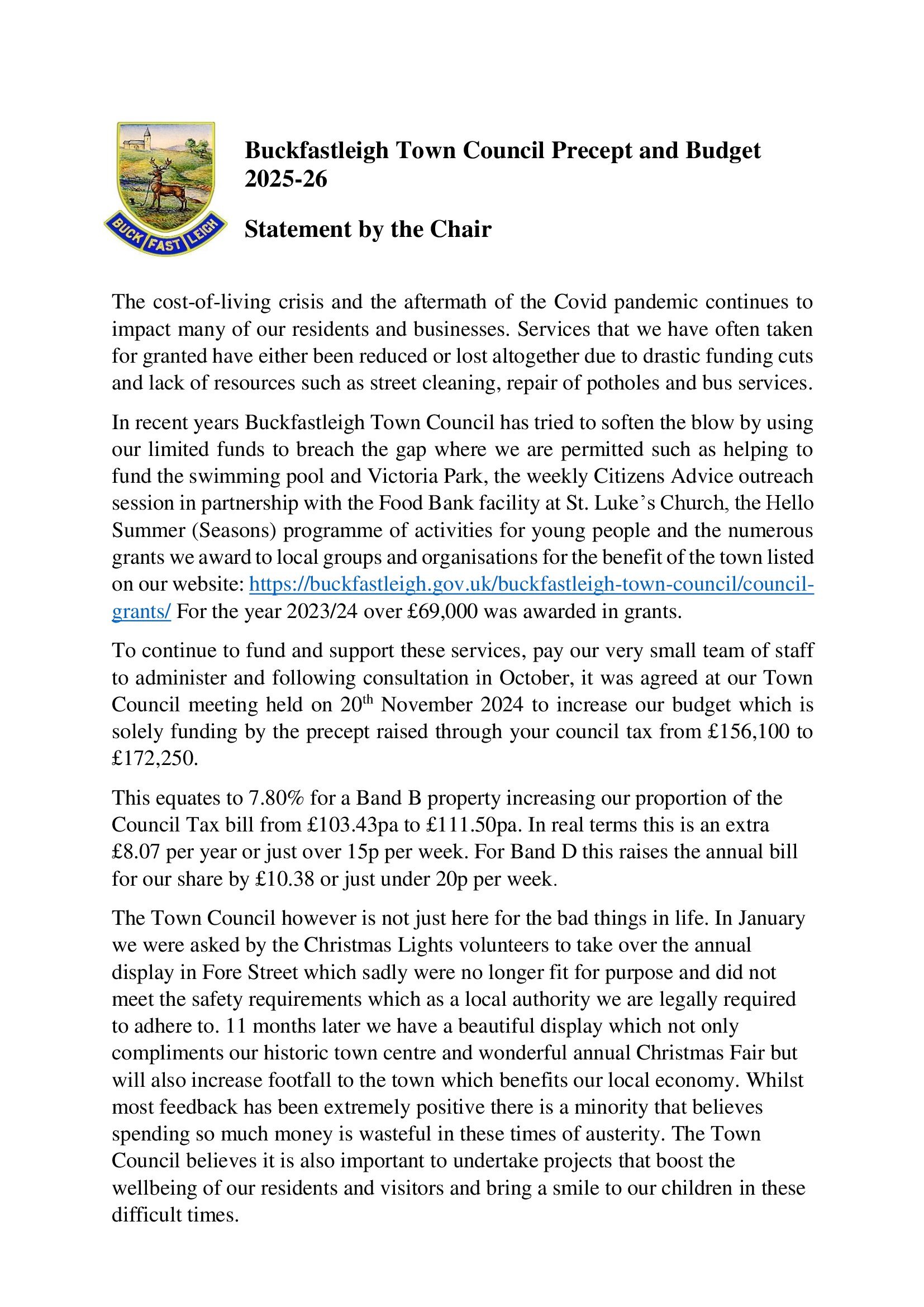 Buckfastleigh Town Council Precept and Budget Statement by the Chair