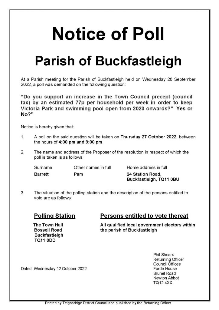 At the Parish Meeting held on Wednesday 28th September in Buckfastleigh Town Hall 10 electors of the parish requested that a parish poll is held to vote on the following question:
