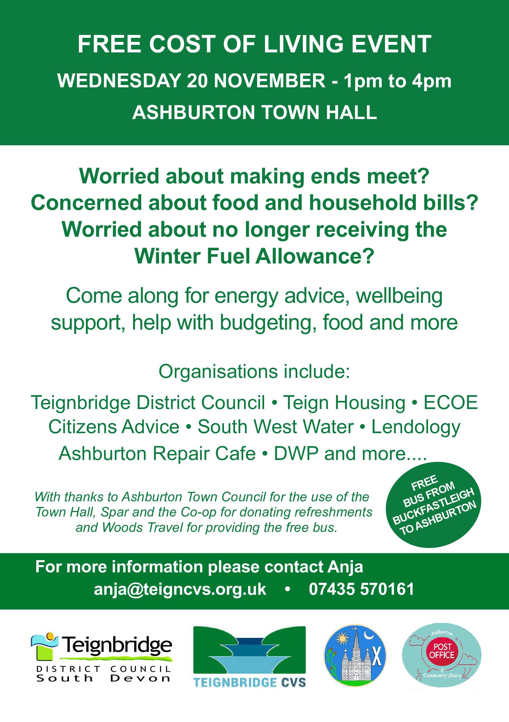 Free Cost of Living Event – Free Bus from Buckfastleigh to Ashburton