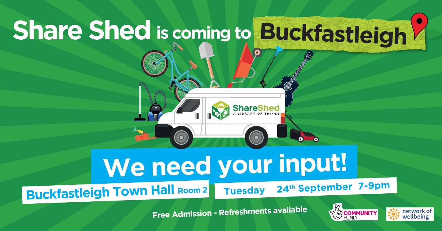 The Share Shed is coming to Buckfastleigh. It has a library of things and equipment which members can borrow for a small fee, and will visit weekly. It saves us all having to buy stuff we only use once or twice a year. Come along to find out more!