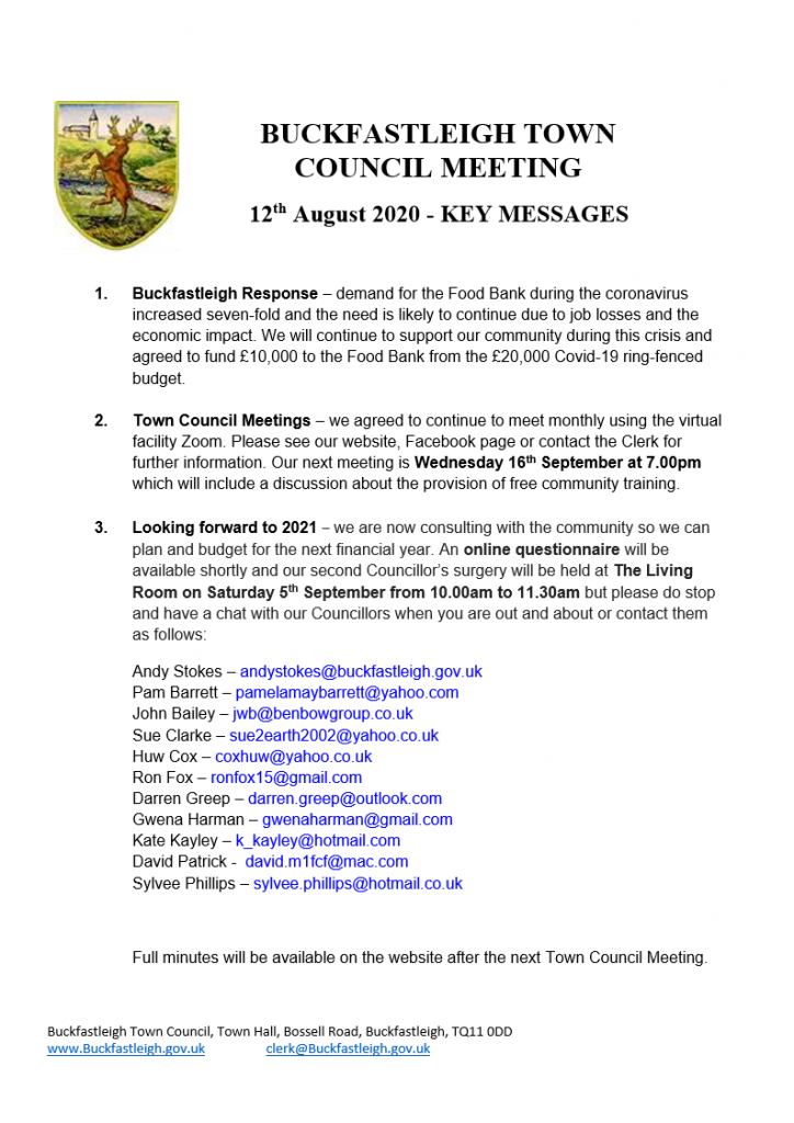 PLEASE NOTE THAT THIS MEETING WILL BE HELD REMOTELY USING ZOOM. PLEASE EMAIL THE CLERK BY 5.30pm PRIOR TO THE MEETING FOR THE MEETING ID AND PASSWORD AT: clerk@buckfastleigh.gov.uk