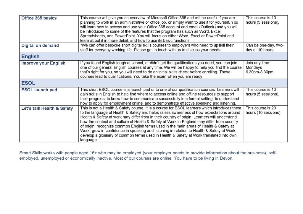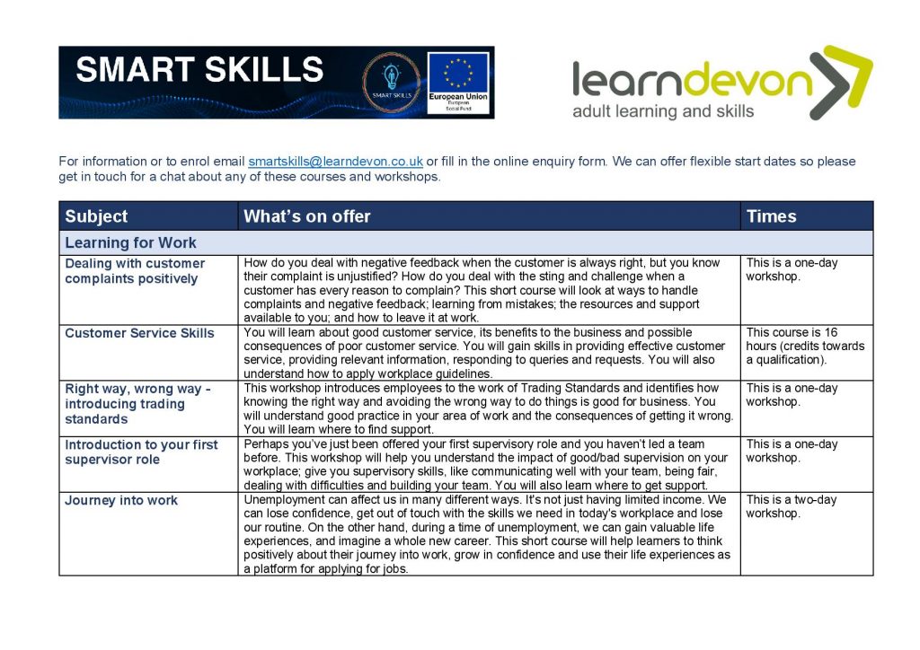 Smart Skills works with people aged 16+ who may be employed (your employer needs to provide information about the business), self-employed, unemployed or economically inactive. Most of our courses are online. You have to be living in Devon.  Email smartskills@learndevon.co.uk for more information.