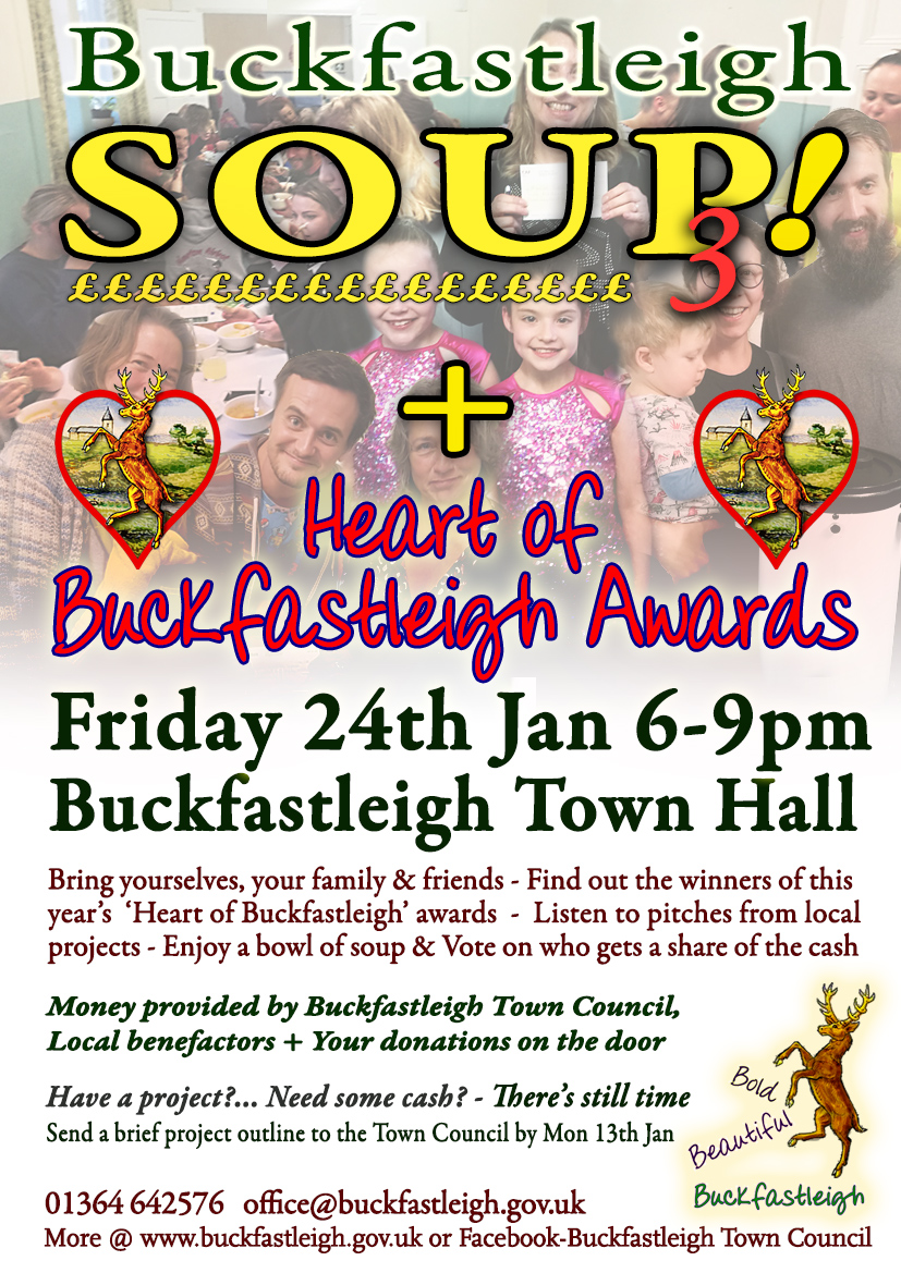 As well as hearing people’s pitches for the new funds, the groups who received money at the previous SOUP will report back on their progress. And the evening will also include the presentation of the Heart of Buckfastleigh Awards to residents of the town who deserve special recognition for their contribution to the town.