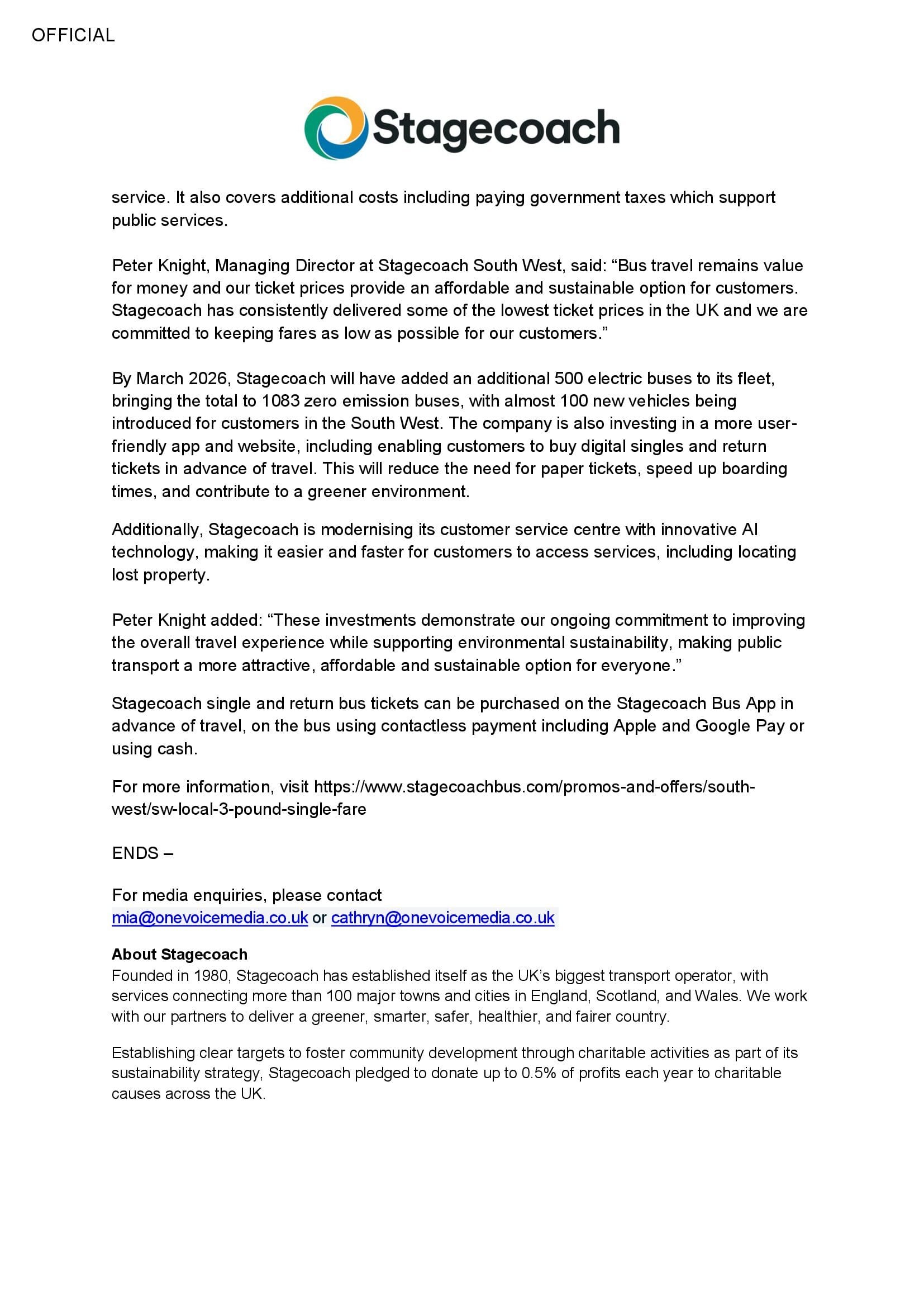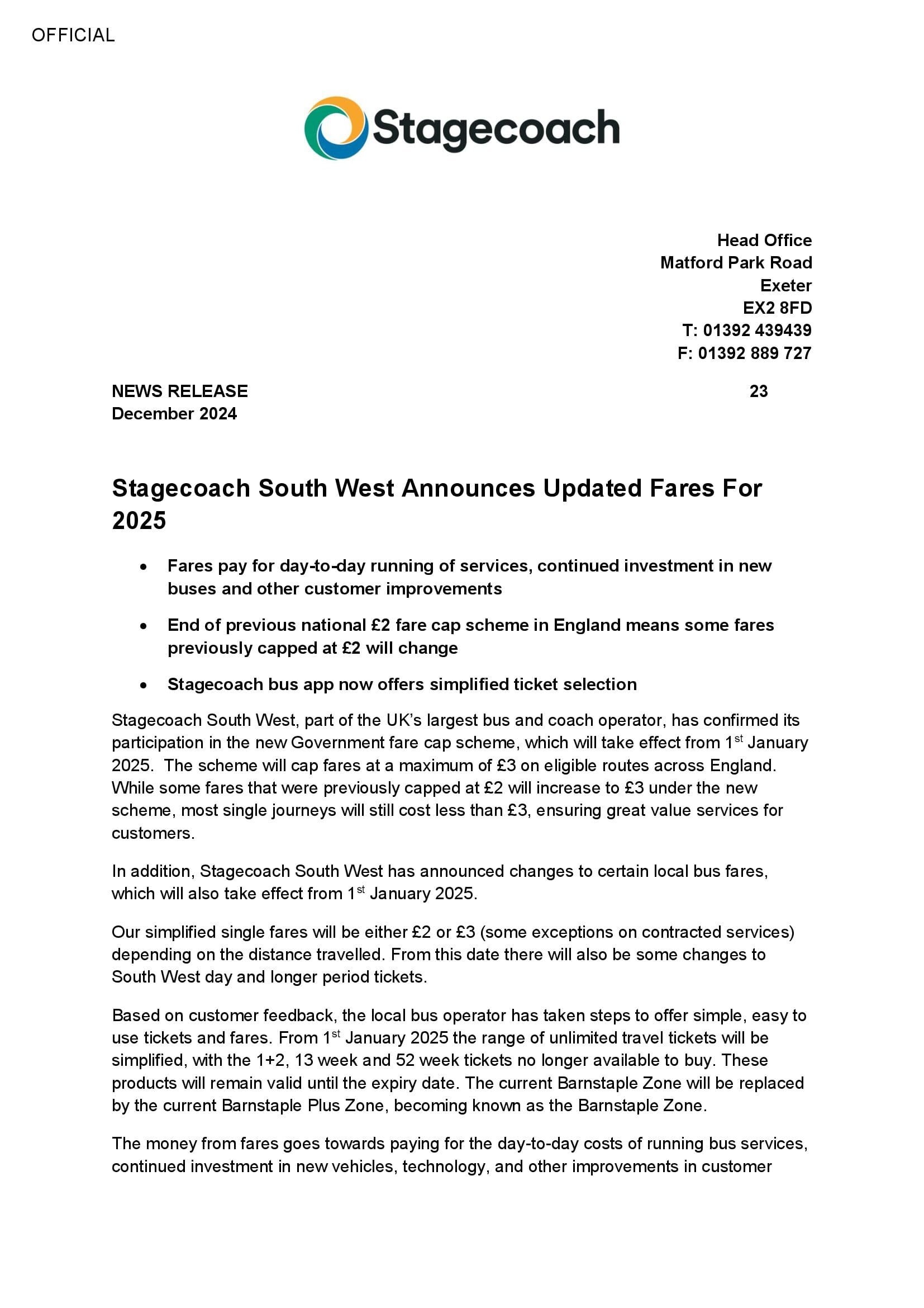 Stagecoach updated fares for 2025