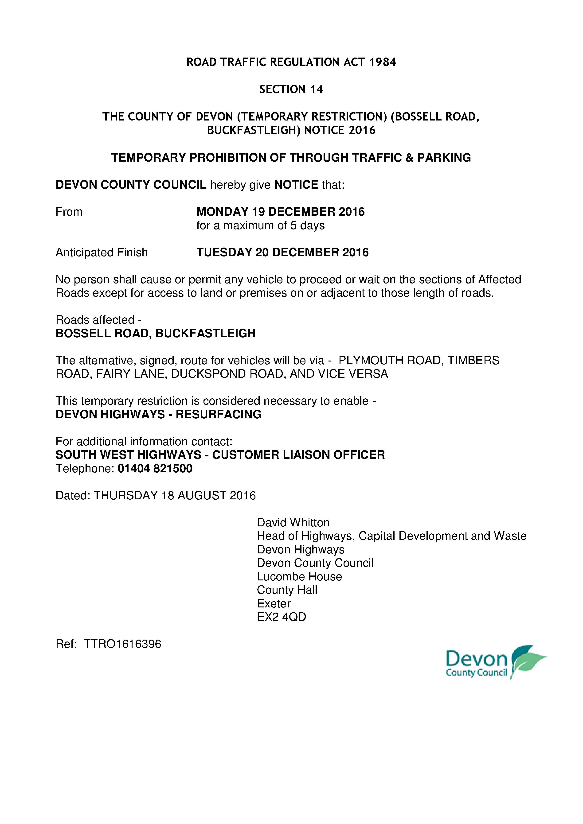 Temporary Road Closure December 2016 Uncategorized 17/08/2016 Temporary Road Closure notice-19th December-20th December 2016