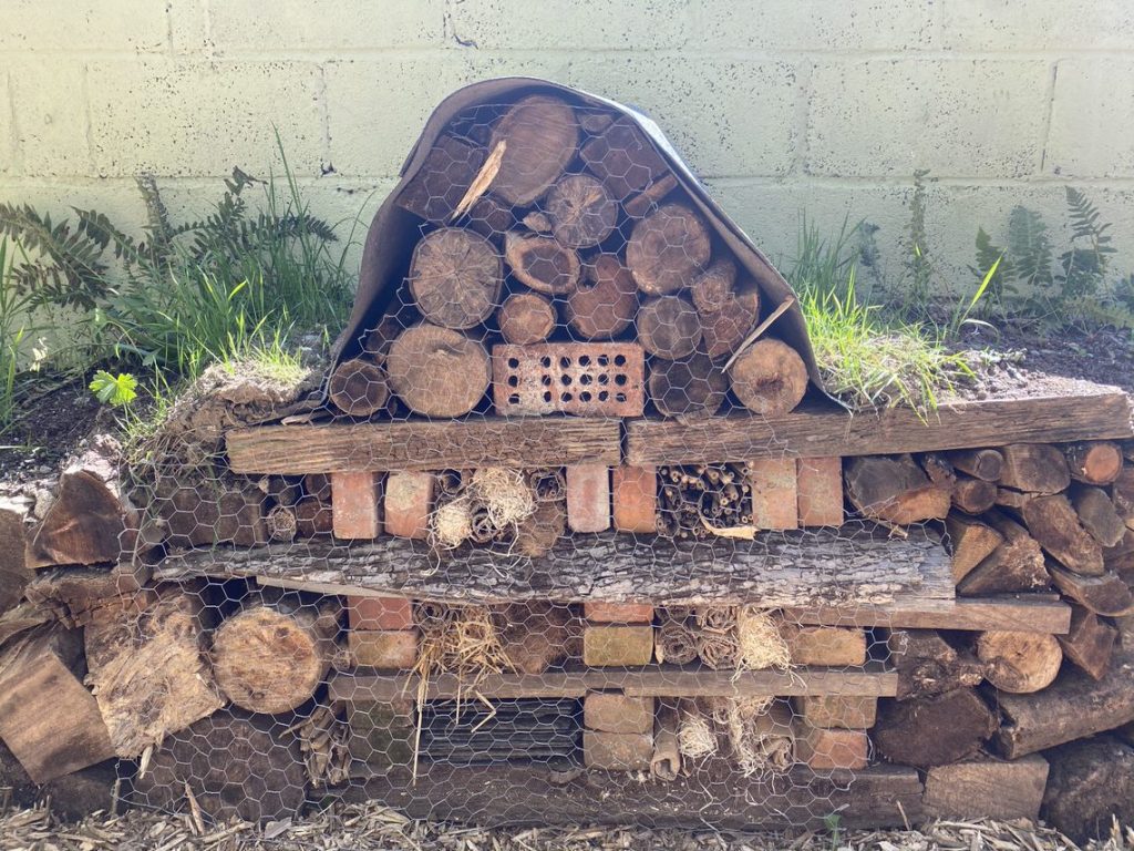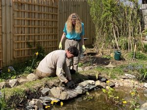 Above left, Charlie Narewski Scullion and volunteer planting around the ponds. Above, the wildlife ponds with bird bath and willow shelter behind. Below, insect hotels.